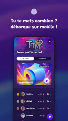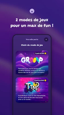 Grooop biedt twee dynamische spelmodi om maximaal te genieten. Ontdek allereerst de 'Grooop'-modus, een interactieve beleving die perfect is om met iedereen te delen. Daag elkaar uit in een reeks waanzinnige mini-games en hilarische opdrachten, strijd om de hoogste score en claim jouw plek op het erepodium. Deze modus is ideaal voor feestjes, teamuitjes of gezellige familiemaaltijden. Daarnaast is er de 'TTMC'-modus, een frisse multiplayer-interpretatie van het populaire concept 'Tu te mets combien?'. Hier test je je algemene kennis en parate feiten over diverse onderwerpen. Beantwoord de vragenreeks correct en bewijs wie de scherpste geest in de groep heeft.
