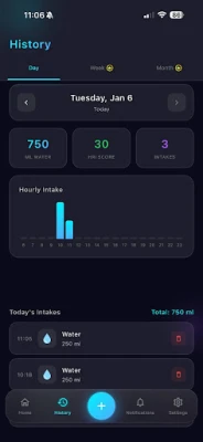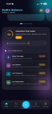 Verkrijg een volledig beeld van uw vloeistofverbruik door naast water ook de inname van koffie, thee, alcohol en andere dranken te monitoren. Ontdek hoe verschillende keuzes uw hydratatiestatus beïnvloeden, en houd tegelijkertijd uw natrium-, kalium- en magnesiuminname bij. Duidelijke visuele overzichten onthullen uw drinkpatronen, waardoor u weloverwogen beslissingen kunt nemen. Intelligente herinneringen, die zich naadloos aanpassen aan uw persoonlijke agenda, zorgen ervoor dat u uw hydratatiedoelen nooit uit het oog verliest, zonder storend te zijn.