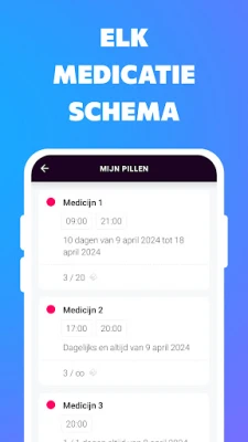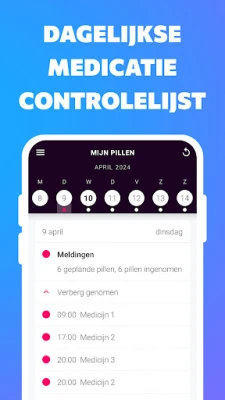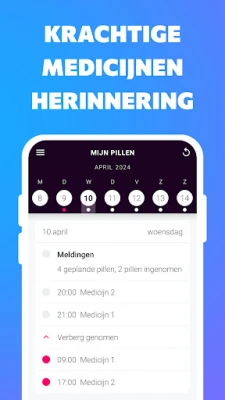 Met deze intuïtieve medicatie alarm app behoort het overslaan van pillen tot het verleden. U bent altijd verzekerd dat u het juiste medicijn, in de correcte hoeveelheid en op het meest geschikte moment inneemt. Ontvang eenvoudigweg een duidelijke melding wanneer het tijd is, registreer uw inname en behoud moeiteloos een compleet historisch overzicht van uw medicijngebruik, alles binnen handbereik.