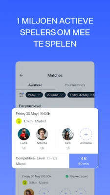 Met Playtomic vind je moeiteloos medespelers voor padel, tennis en andere racketsporten. Word deel van een community van ruim 1 miljoen enthousiaste spelers. Playtomic biedt een intuïtieve en gebruiksvriendelijke ervaring, speciaal ontworpen voor jouw sportplezier.